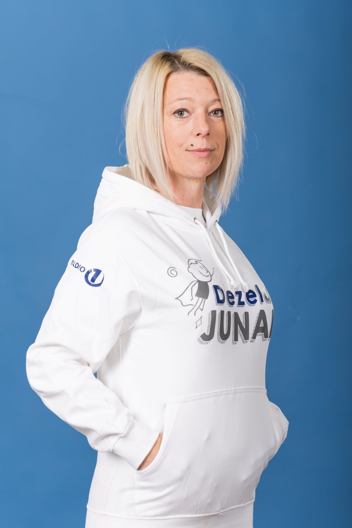 Bel hoodie oziroma pulover s kapuco Deželak Junak s prednjim žepom.